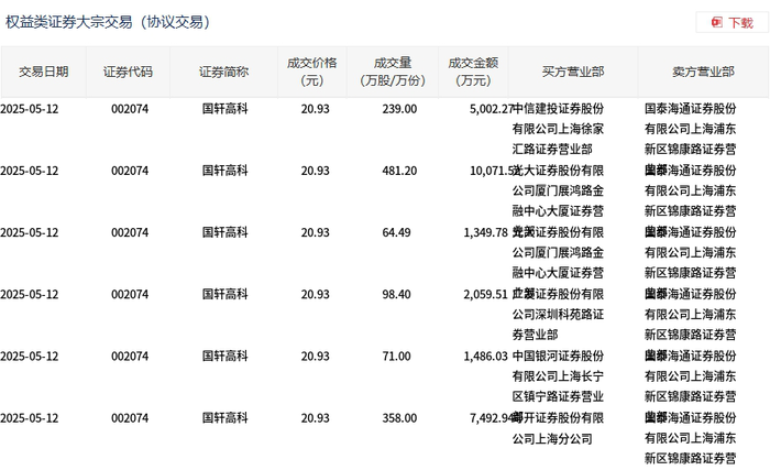 5月12日,国轩高科大宗交易成交1312.09万股,成交额2.75亿元,占当日总成交额的8.84%,成交价20.93元,较市场收盘价24.15元折价13.33%。